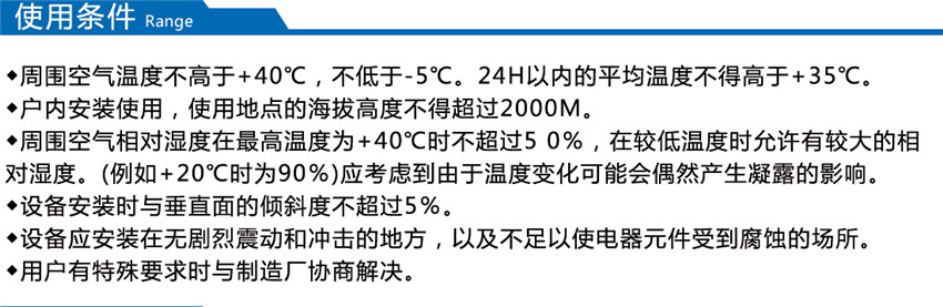裝置適用于發電廠、石油、化工、冶金、紡織、高層建筑等低壓配電系統。海拔高度不超過1000m;周圍環境溫度-25℃ - +40℃;無導電性塵埃、腐蝕性氣體和水蒸氣的場所;無火災和爆炸危險的場所;無經常性劇烈震動場所。