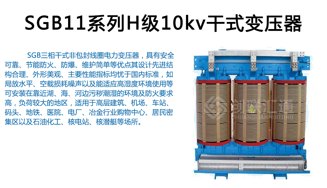 SG(B)11系列H級絕緣干式變壓器采用優(yōu)質環(huán)保材料,先進的生產檢測設備按嚴格的工藝生產而成,具有高性能、高安全、承受熱沖擊能力強等特點,它適用于防火要求高、負荷波動大以及污穢潮濕的惡劣環(huán)境中。如:高層建筑、商業(yè)中心、住宅小區(qū)、醫(yī)院、化工廠、核電站、船舶及其它安全性要求防火、防爆、防潮的配電網絡與工礦企業(yè)供配電系統(tǒng)等重要或特殊環(huán)境場所。