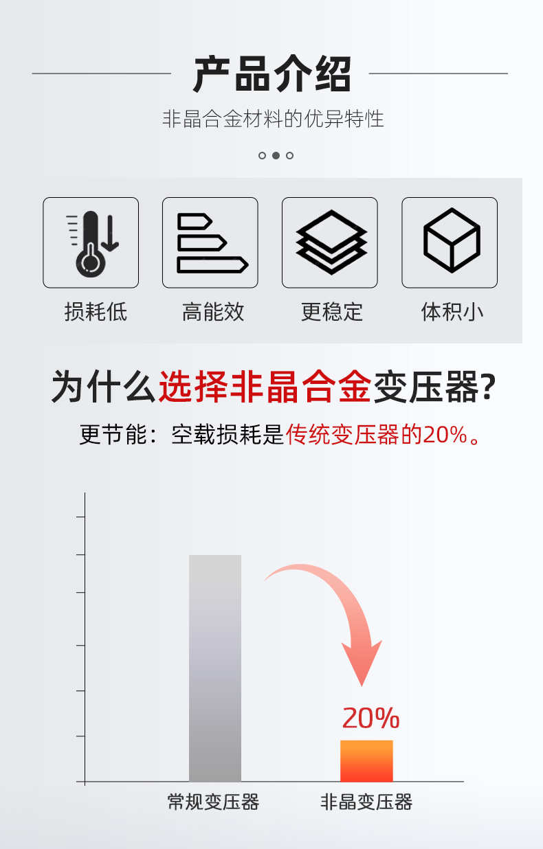 該變壓器的鐵芯采用非晶合金材料,相比傳統的硅鋼片材料,其磁導率高,鐵損耗低,磁飽和感低,從而使得變壓器的效率得到了進一步提高。另外,非晶合金材料在加工時可以制成形狀各異的薄帶狀材料,鐵芯損耗低,結構緊湊,提高了變壓器的功率密度,進一步減小了變壓器的體積和重量。